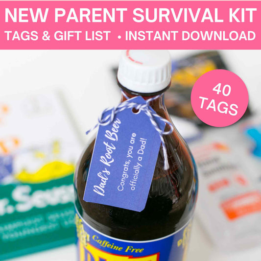 (Editable) New Parent Survival Kit- 40 Tags For Mom & Dad
